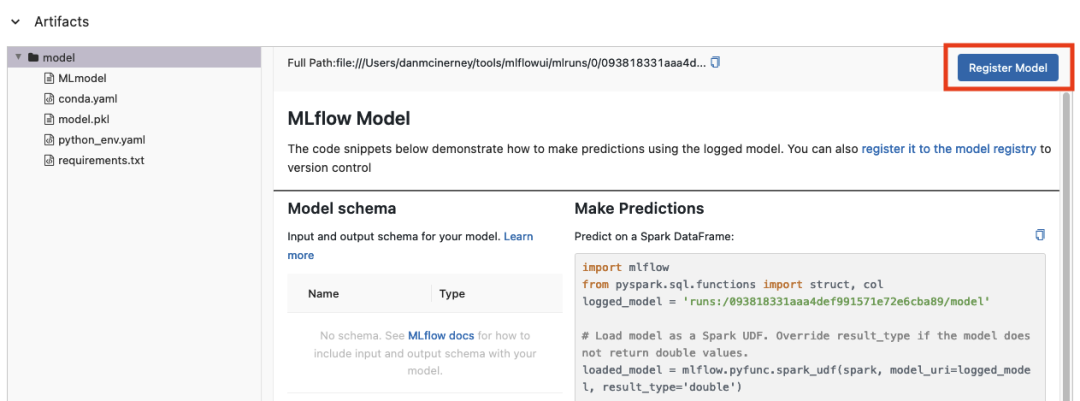 在这里,我们在工件文件中看到了一个很大的“Register Model”(注册模型)按钮。我们很好奇。