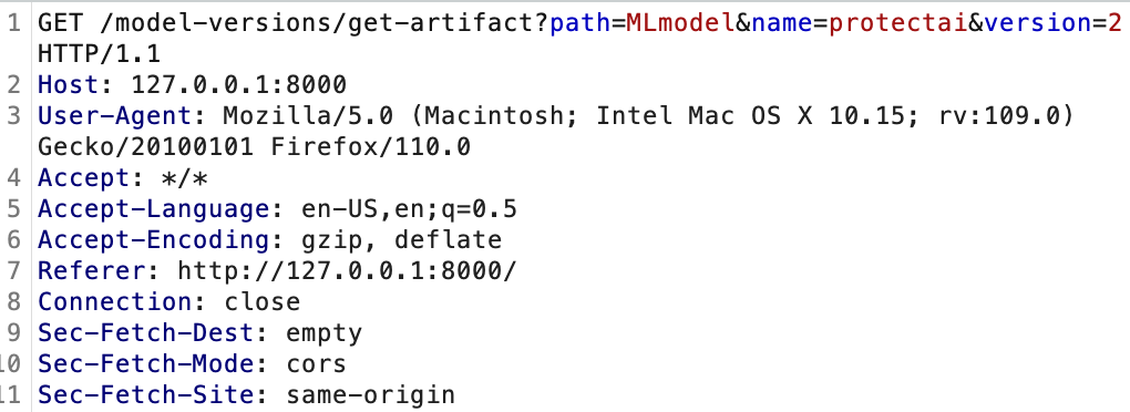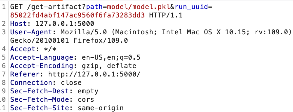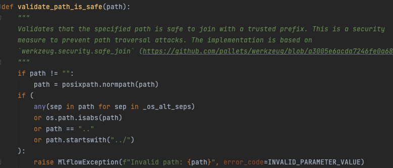 get-artifact API调用中的“500内部服务器错误”让我们感到可疑。在安全测试的早期,get-artifact API调用值得注意,因为它是从工件存储库返回文件数据的调用。这是你从实验运行下载模型的方法,我们发现它受到了一个防止本地文件包含漏洞的函数的保护,如下所示。