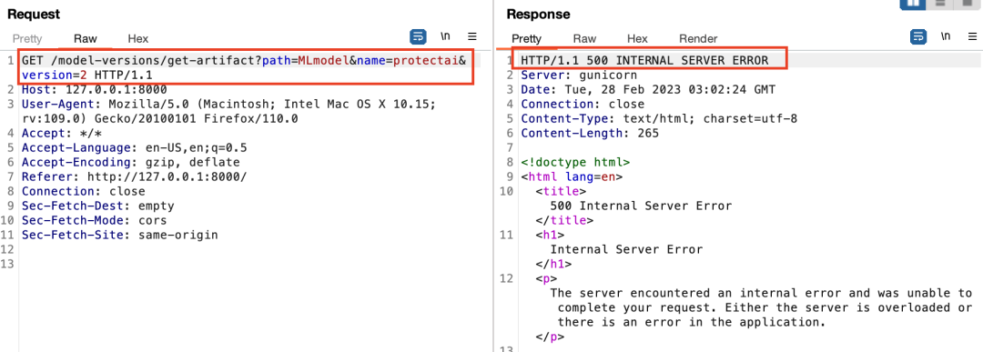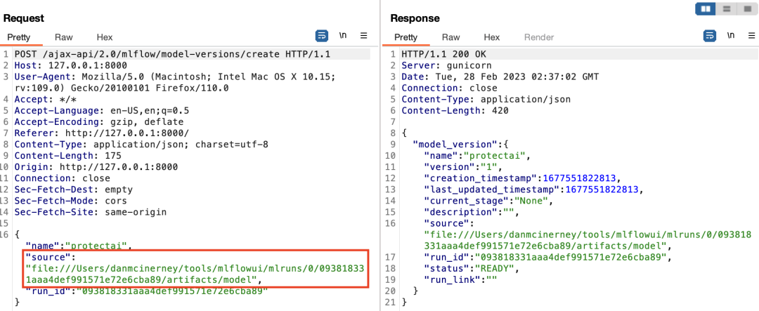 新的source在响应中有所体现,这通常表明服务器端出现了变化。我们很想知道这实现了什么操作,于是回过头去查看已注册的模型细节。实验中没有什么运行工件,模型细节或模型版本细节中也没有值得关注的对象。这似乎是另一条死胡同,类似我们发现你可以将实验工件路径指向任意位置,但UI随后不让你任何操作。然而在检查BurpSuite请求和响应日志后,我们发现了一些值得关注的异常。