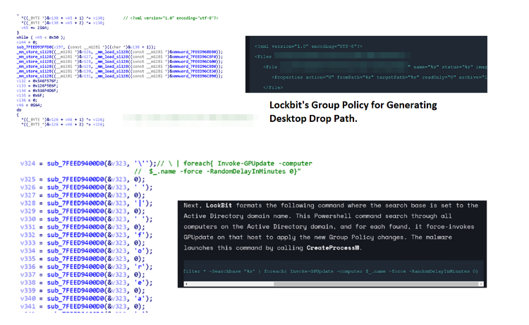 Lockbit(2.0)的一个共同特征是使用相同的组策略来生成桌面放置路径。同样,使用vssadmin删除卷影副本也是LockBit攻击中大量使用的例程(尽管也是许多现代勒索软件的常见例程)。尽管如此,这种相似之处还是不可思议的。此外,它运行相同的命令来为AD执行GPUpdate。因此,该勒索软件的检测仍属于LockBit家族。