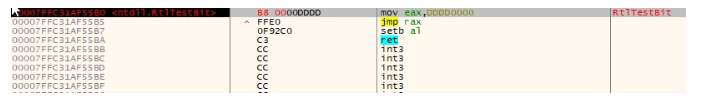 BabLock是通过挂钩API Ntdll的攻击注入加载的。RtlTestBit跳转到包含勒索软件代码的内存。