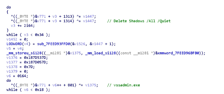 勒索软件二进制文件解密并执行命令行以删除卷影副本