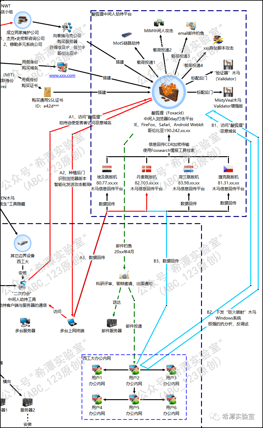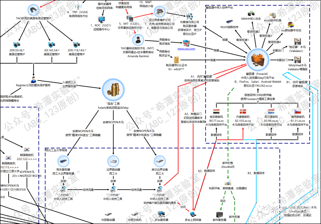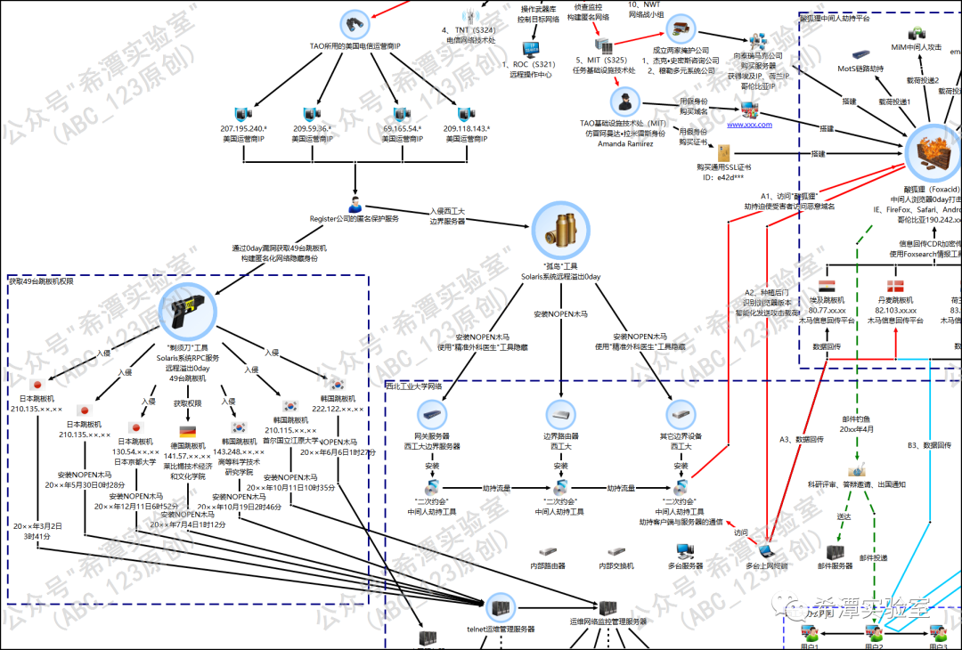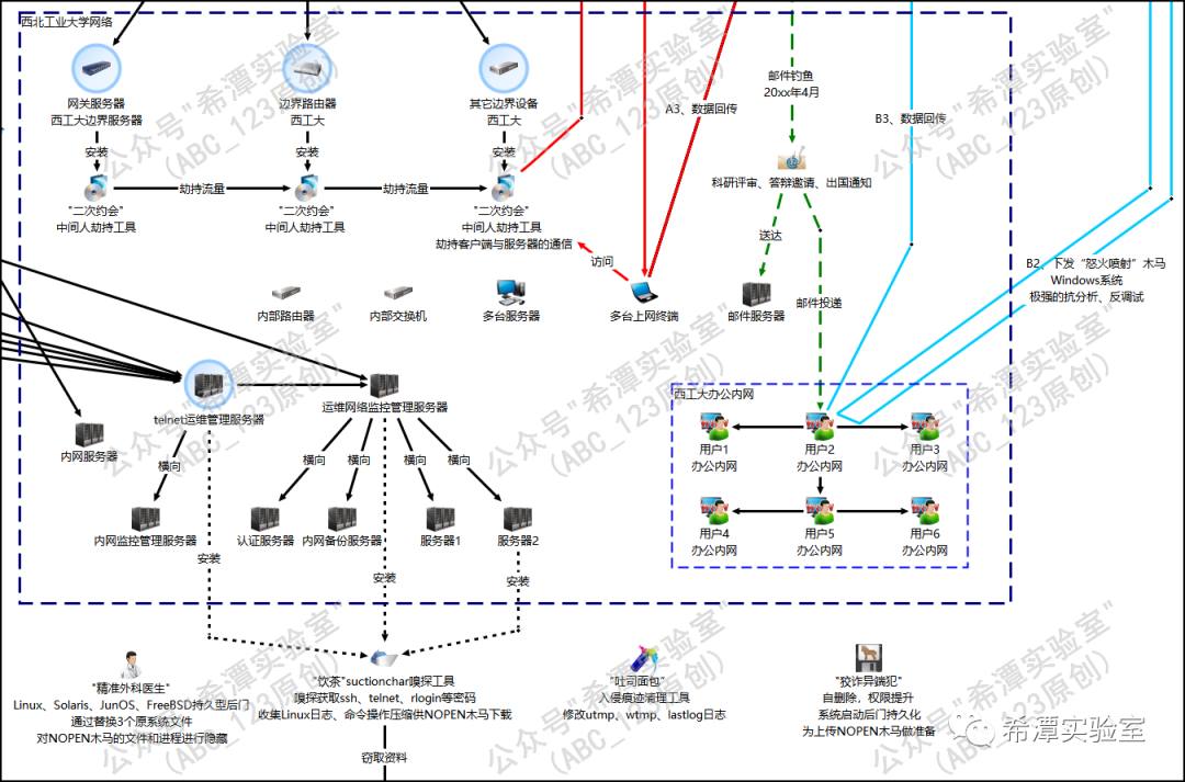 大家好,我是ABC_123,公众号正式更名为”希潭实验室”,敬请关注。前几周写了一篇《第56篇:美国安全局NSA入侵西北工业大学流程图梳理和分析(上篇)》文章,得到了广泛关注,成为本人公众号首篇访问量破2万的文章。今天ABC_123重新参考官网的报告,一字一句对该篇文章进行了校勘,补充部分细节,流程图增加了邮件钓鱼过程,更正了部分图标,然后重新发布此文章,给广大的网络安全从业人员提供一个参考,更好地为祖国的网络安全事业做出贡献。