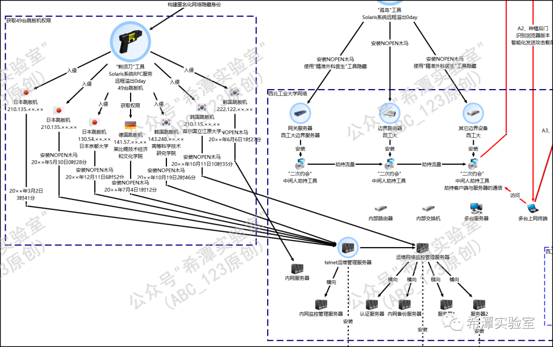 如下图所示,NSA在不同的时间段,通过前期获取的各个国家的跳板机作为指令中转,非法入侵了西北工业大学运维网络的“telnet”运维管理服务器、运维网络监控管理服务器、内网服务器等服务器,利用木马级联控制渗透的方式,向西北工业大学内部网络深度渗透,先后控制运维网、办公网的核心网络设备、服务器及终端,并获取了部分西北工业大学内部路由器、交换机等重要网络节点设备的控制权,窃取身份验证数据,并进一步实施渗透拓展,最终达成了对西北工业大学内部网络的隐蔽控制。
