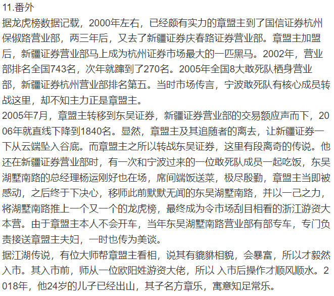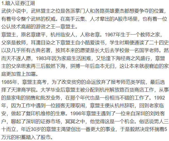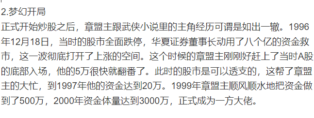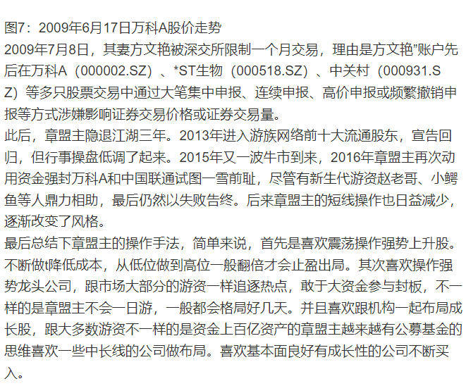 2009年6月17日,章盟主买入10亿元万科A,强行把过千亿市值的万科A封板涨停。随后又投入了接近10亿,各路游资纷纷助阵,总投入40亿人民币和公募机构正面对决,但章盟主还是失败了。