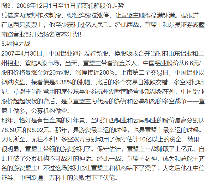 2007年12月14日,章盟主开始建仓中信证券:首次以84元左右的价格买入1.68亿元,次日又加仓买入2.23亿元。2008年1月8日,章盟主尝试拉升突破,耗资5.3亿强势将中信证券最高拉至98.88元,但出乎意料的是中信证券没能封住涨停,最终以92.88元的价格收盘。随后的交易日,机构开始疯狂砸盘,中信证券狂跌不止。2008年1月22日,股价下跌至72.57元。不甘失败的章盟主纠结多路游资多次尝试反扑,均以失败告终,最终章盟主在此战损失2亿多人民币。