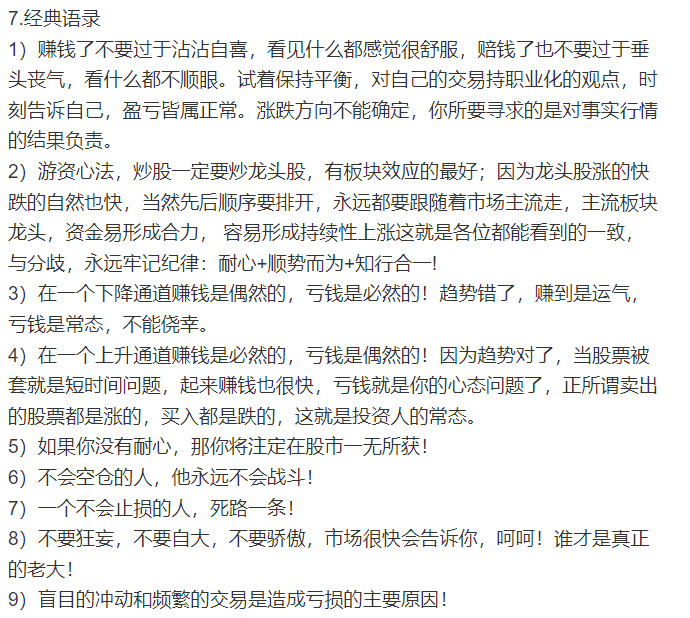 2)游资心法,炒股一定要炒龙头股,有板块效应的最好;因为龙头股涨的快跌的自然也快,当然先后顺序要排开,永远都要跟随着市场主流走,主流板块龙头,资金易形成合力, 容易形成持续性上涨这就是各位都能看到的一致,与分歧,永远牢记纪律:耐心+顺势而为+知行合一!