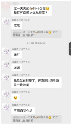 哥哥你知道什么叫网暴吗?不知道就不要乱说好不好,首先我们没有人身攻击也没有进行污蔑和诋毁,这只是正常评论而已,每个人都有自己的观点,难道这个世界上就只能存在一种观点吗,有其他的观点就是网暴吗?再说了,哥哥这是小群,我们就算是说这也是私底下,并没有外传和散播,更没有对本人造成困扰,如果这都算网暴的话,那请问您的言论算什么呢,您都散播了,也对我们的名誉造成了影响,并且言论十分恶毒,这不也是网暴吗?这如果都不算网暴的话那您告诉我网爆的定义到底是什么?还是所有事情都必须听您的?