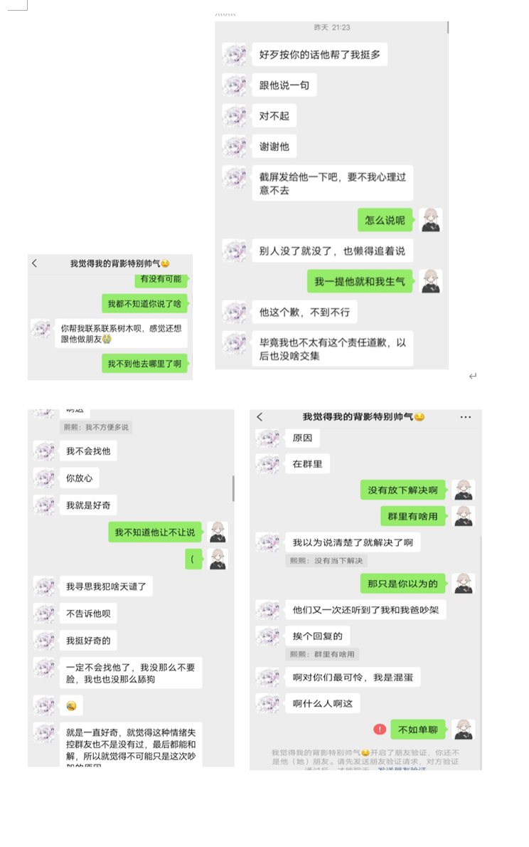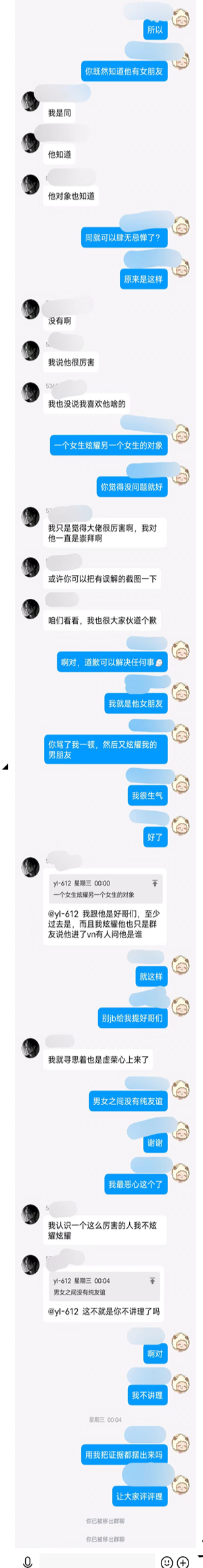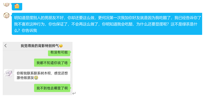 好了,大概就是这样,097师傅,小群那么多个你不发,专挑人家比赛通知群发你的这档子事是什么意思?占用公共资源博关注?让大家同情你????笑了,非得在大群发证据,你不就是想让所有人都同情你的遭遇,然后反过来骂我们吗,可了,就你这点小心思,我还不知道?你这不是绿茶的典型行为吗?