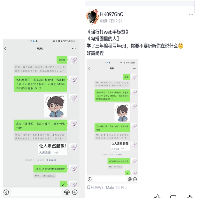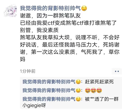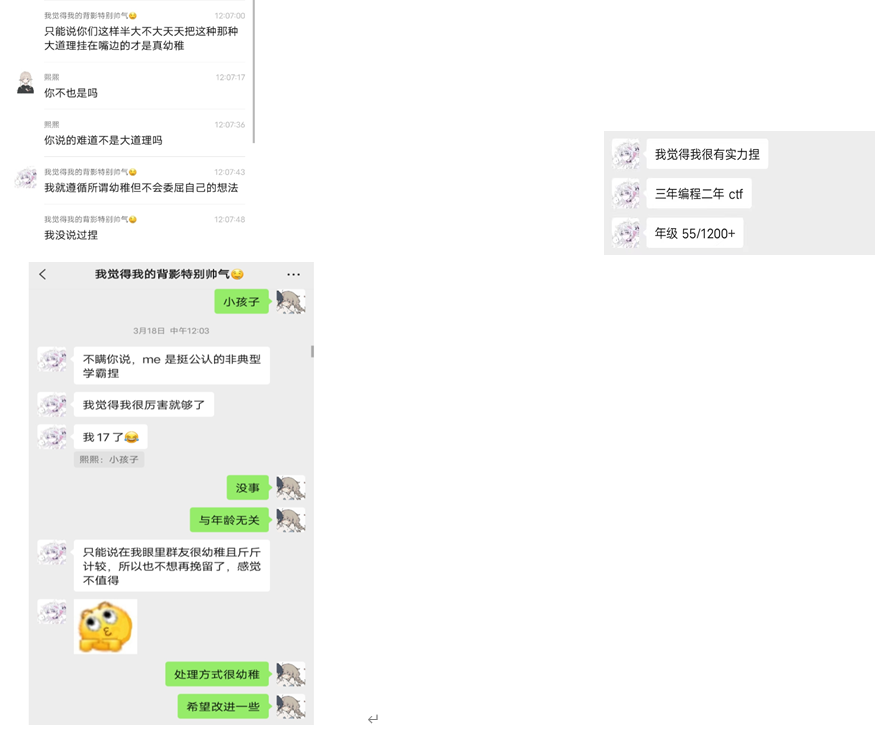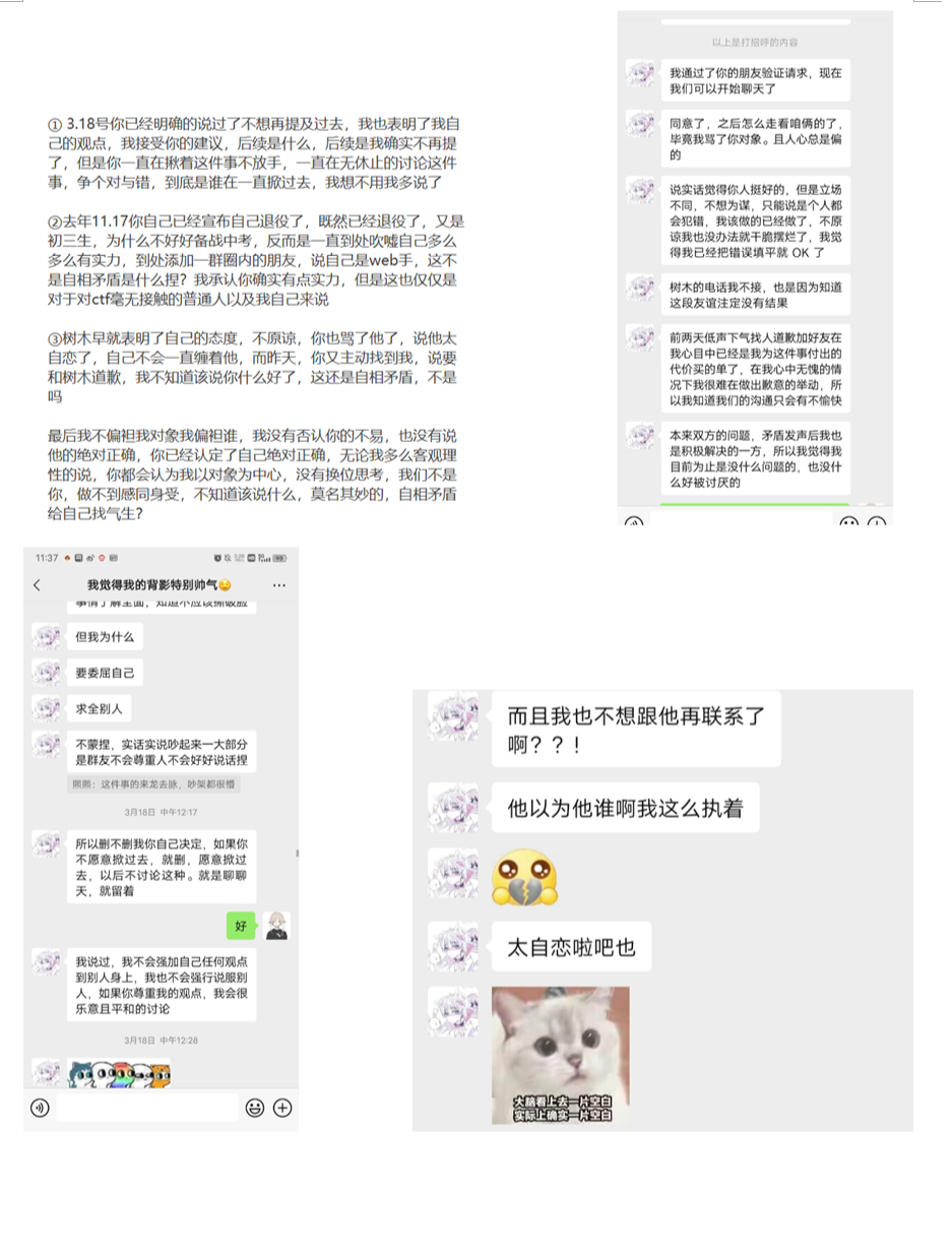 师傅们图个乐子就好了,毕竟这只是我的一面之词,097师傅如果还有什么想反驳我的证据的话,随时摆在我面前,不要小群不理我,把我们拉黑了,去其他师傅的大群发泄自己的委屈,造谣他人