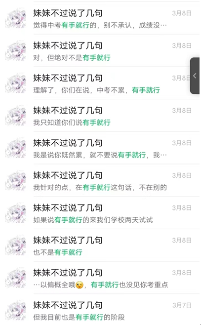 随后你又转变了自己的观点说,针对的点是某位师傅3.7号晚上说的一句中考有手就行,不是我说哥们你这反射弧也忒长了吧,人家成绩好,觉得中考简单表明一下自己的观点怎么了,难道全天下的人都必须成绩不好,觉得中考非常困难?就不允许有学霸的存在了呗,你成绩不如意,也不允许别人成绩好吗?见不得别人好?