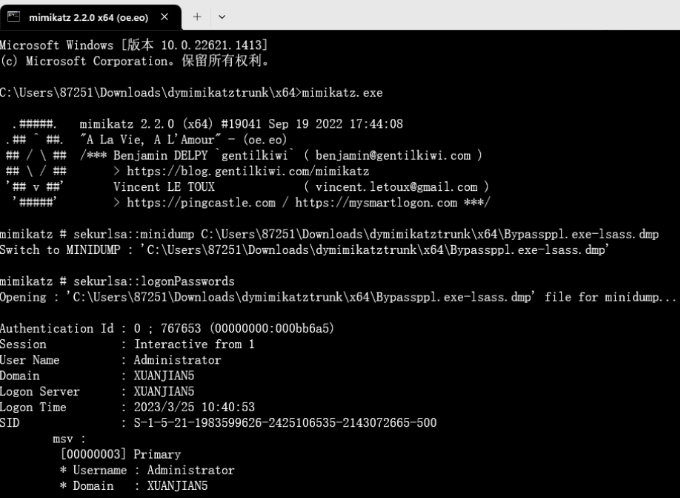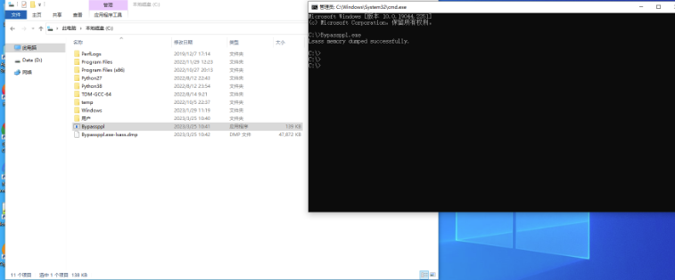 1、将编译后的文件放到目标靶机上以管理员身份运行,即可获得dump文件