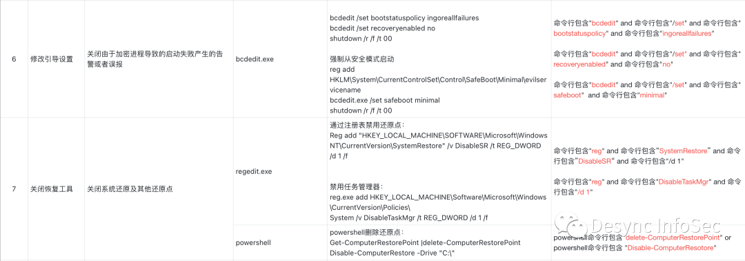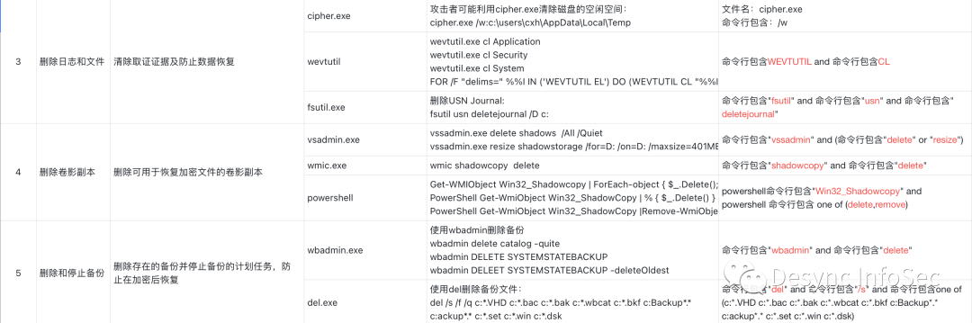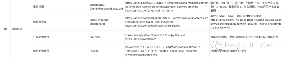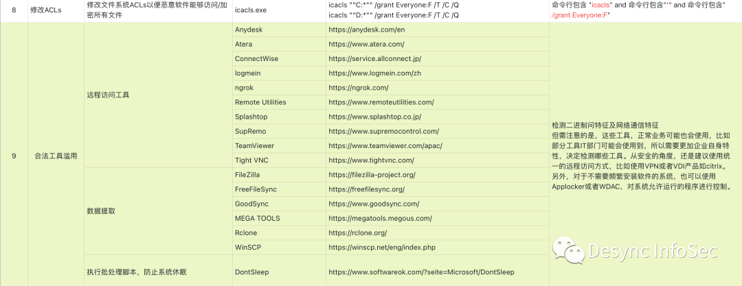下面总结了一些的勒索团伙常用的TTPs,大家在蓝队或者SOC建设过程可以作为参考,评估下现有的检测措施,能否检测到这些攻击行为。
