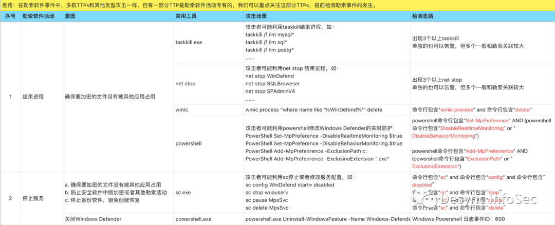 当然,作为防守方,我们并非没有胜算。在勒索软件事件中,多数TTPs和其他类型攻击一样,但有一部分TTPs是勒索软件活动专有的,我们可以重点关注这部分TTPs,提前检测勒索事件的发生。