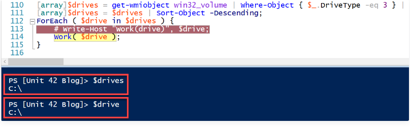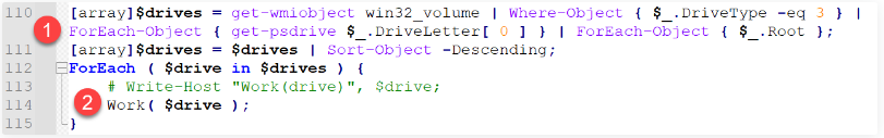2.它作为$drive遍历主机上标识的驱动器,将每个标识的驱动器路径传递给Work()函数。