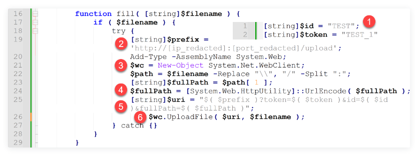 fill()函数执行实际的数据窃取。此函数用于构建将用于窃取文件的URL,并使用System.Net.Webclient对象通过HTTP POST事件使用对象的.UploadFile方法执行实际的窃取。下图显示了fill()函数。