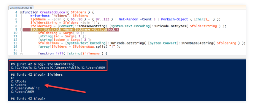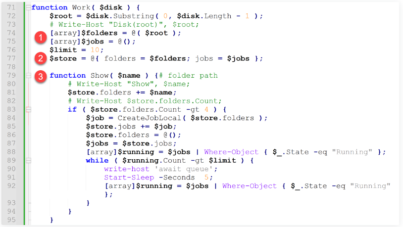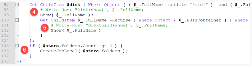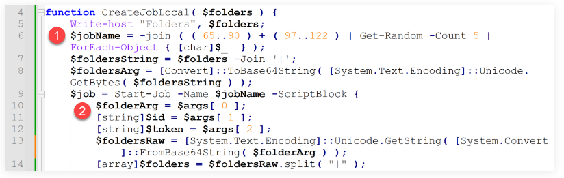 6.Show()函数创建PowerShell作业以方便窃取数据。该函数一次处理5个目录组。这部分代码可以起到保护作用,以确保处理所有剩余的文件夹分组。