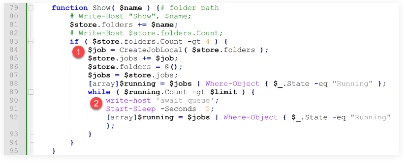 1.该函数收集提供的目录名,直到它可以创建一个由5个目录名组成的分组。一旦向函数提供了5个目录名,它将它们传递给CreateJobLocal()函数以创建PowerShell作业,以便从目录组中导出数据。