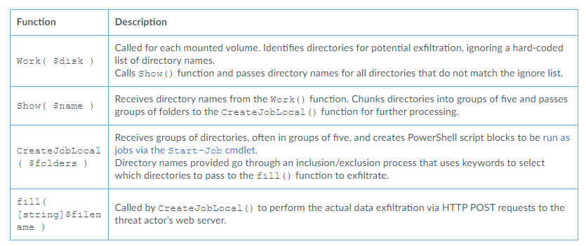 该组织使用多种方法从受害者的网络中窃取数据。一些使用者会使用外部工具,包括FileZilla、WinSCP和rclone等工具。还有使用者使用 LOLBAS(Living off the Land Binaries And Scripts)技术,如PS脚本,通过远程桌面协议(RDP)复制/粘贴和微软的Win32 API(例如Wininet.dll调用)。让我们来看看当使用PS脚本自动执行勒索软件攻击的数据泄露阶段时会发生什么。