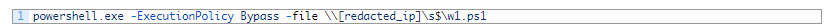 此脚本调用使用统一资源名称(URN)路径中的本地域控制器(DC)IP地址(如上面的[redected_IP]所示),指定DC上的s$admin共享。请注意,由于脚本是通过客户端的DC部署的,因此目标计算机可能是攻击者尚未获得直接访问权限的计算机。因此,网络中的任何端点都可能成为脚本的目标。为PS可执行文件提供-ExecutionPolicy Bypass参数以绕过任何执行策略限制。