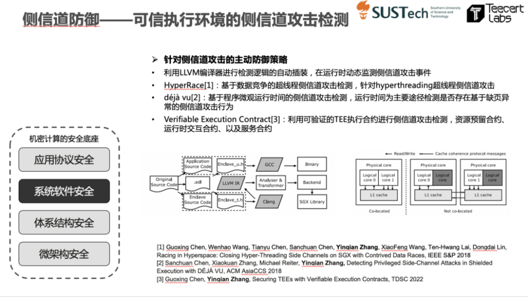 进一步地,张教授从侧信道防御,漏洞自动检测和可信执行环境虚拟化三个方面介绍了自己在系统软件安全层面的相关研究工作。侧信道防御方面提出了几种针对侧信道攻击的主动防御策略,利用LLVM编译器进行检测逻辑的自动插装,在运行时动态监测侧信道攻击事件。在漏洞自动化检测方面,使用程序静态分析和动态分析技术检测可信执行环境软件的侧信道漏洞、并发漏洞。在可行执行环境虚拟化方向,提出了基于SEV的SGX虚拟化方案,在AMD机器上直接运行未修改的Intel SGX二进制程序,实现AMD SEV和Intel SGX应用的兼容。