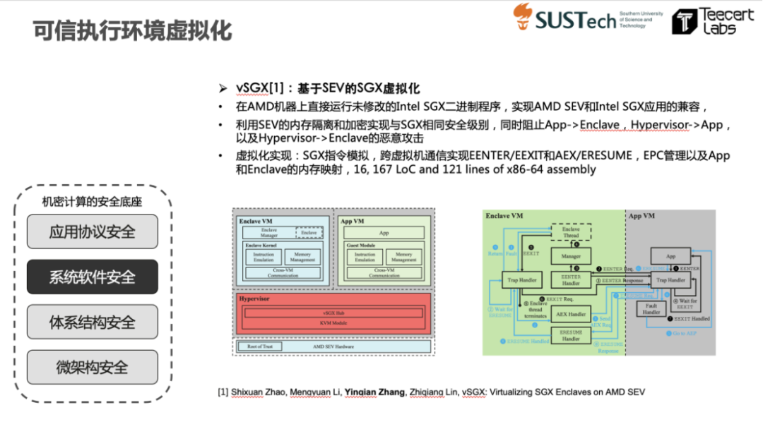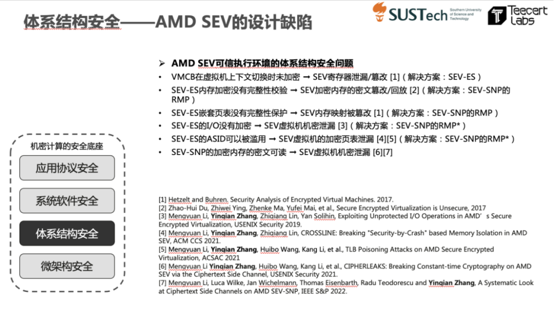 其次,在体系结构安全层次,张教授介绍了AMD SEV可信执行环境的一系列体系结构安全问题以及张教授所提出的各种针对性解决方案。