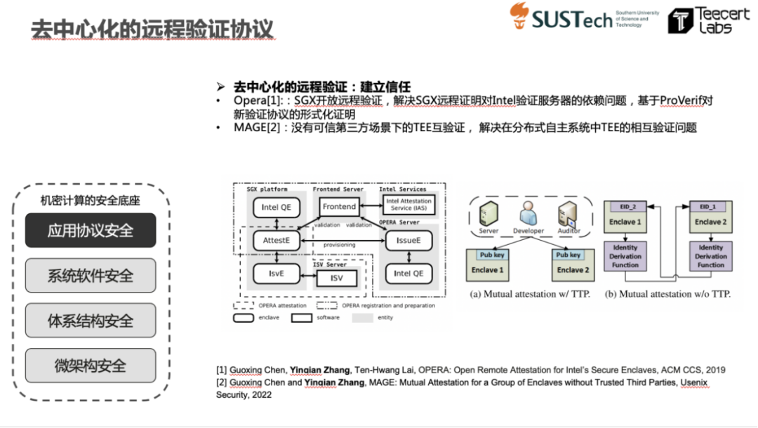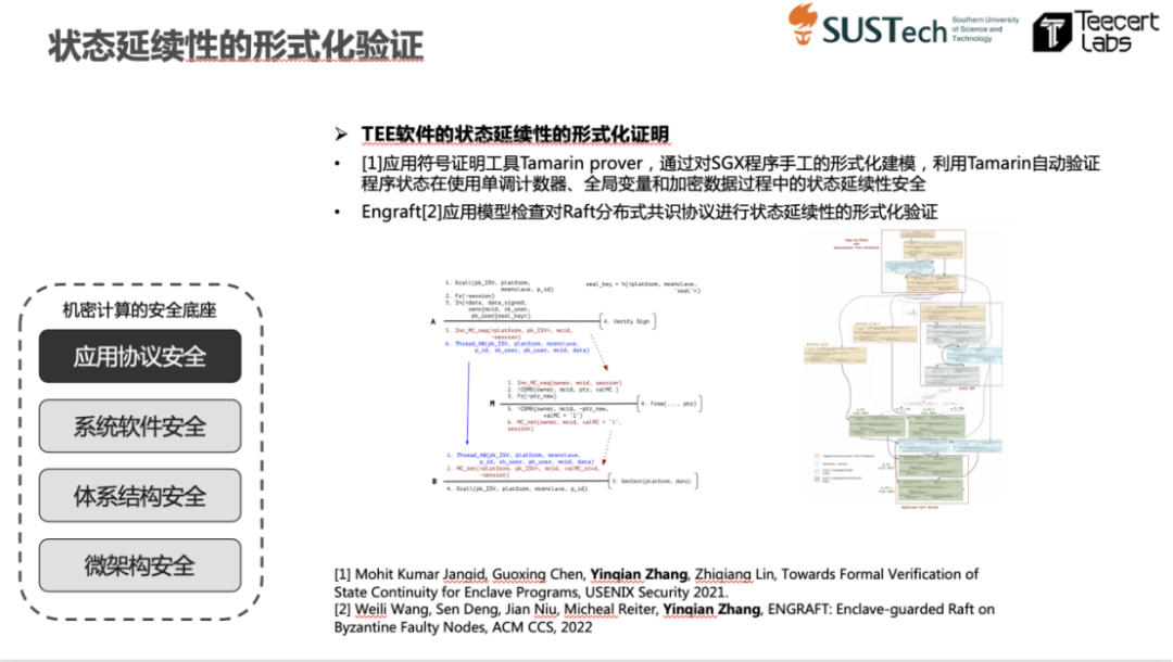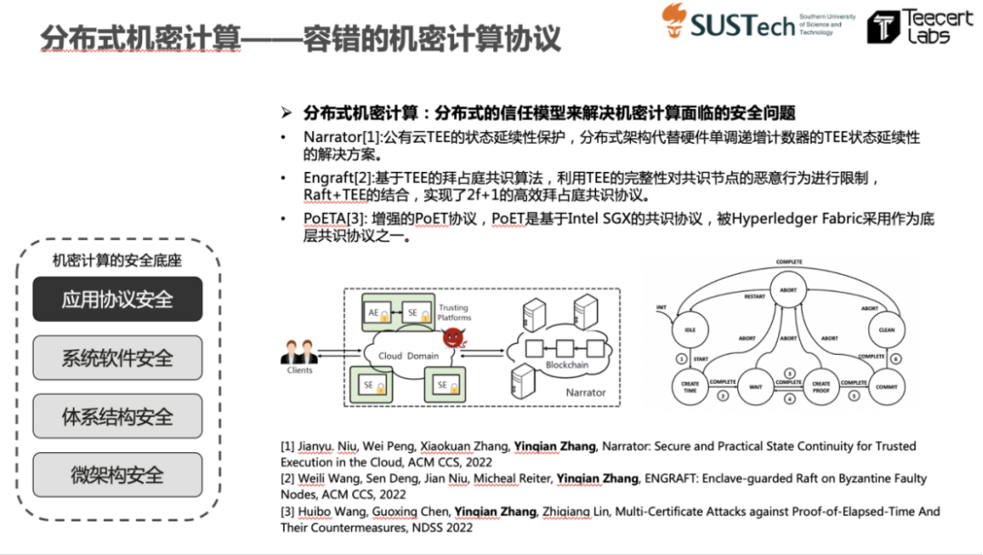 针对这些问题,张教授分别研究了针对TEE软件的状态延续性的形式化证明;提出了分布式机密计算协议,利用分布式的信任模型来解决机密计算面临的安全问题;以及去中心化的远程验证方案。