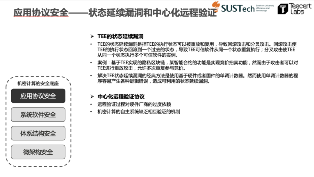 在应用协议安全层面,张教授介绍了状态延续漏洞和中心化远程验证协议的问题。TEE的状态延续漏洞是指TEE的执行状态可以被重放和复用,导致回滚攻击和分叉攻击。回滚攻击使TEE的执行状态回滚到一个过去的状态,导致TEE可信软件从同一个状态重复执行;分叉攻击使TEE从同一个状态执行多个可信软件的实例。中心化远程验证协议的远程验证过程存在对硬件厂商的过度依赖,并且机密计算的自主系统缺乏相互验证的机制。