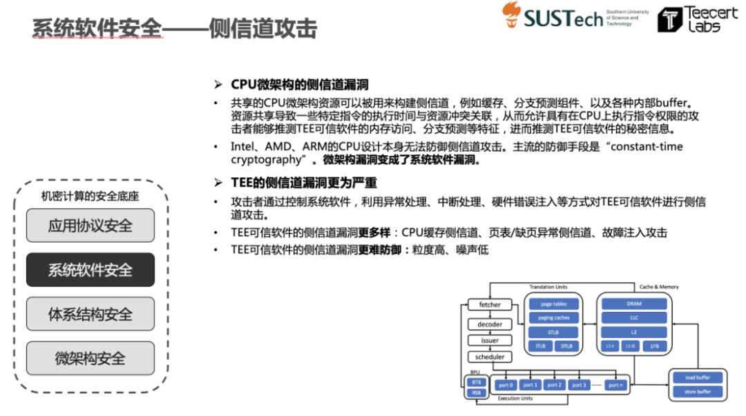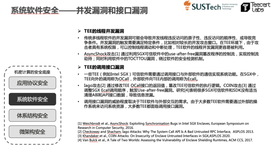 紧接着,在系统软件安全层面,张教授分别从侧信道攻击、内存安全漏洞、并发漏洞和接口漏洞方面介绍了目前存在的安全风险。首先,侧信道攻击方面,共享的CPU微架构资源可以被用来构建侧信道,例如缓存、分支预测组件、以及各种内部buffer。资源共享导致一些特定指令的执行时间与资源冲突关联,从而允许具有在CPU上执行指令权限的攻击者能够推测TEE可信软件的内存访问、分支预测等特征,进而推测TEE可信软件的秘密信息。TEE的侧信道漏洞更为严重,攻击者通过控制系统软件,利用异常处理、中断处理、硬件错误注入等方式对TEE可信软件进行侧信道攻击,形式更加多样,更难防御。