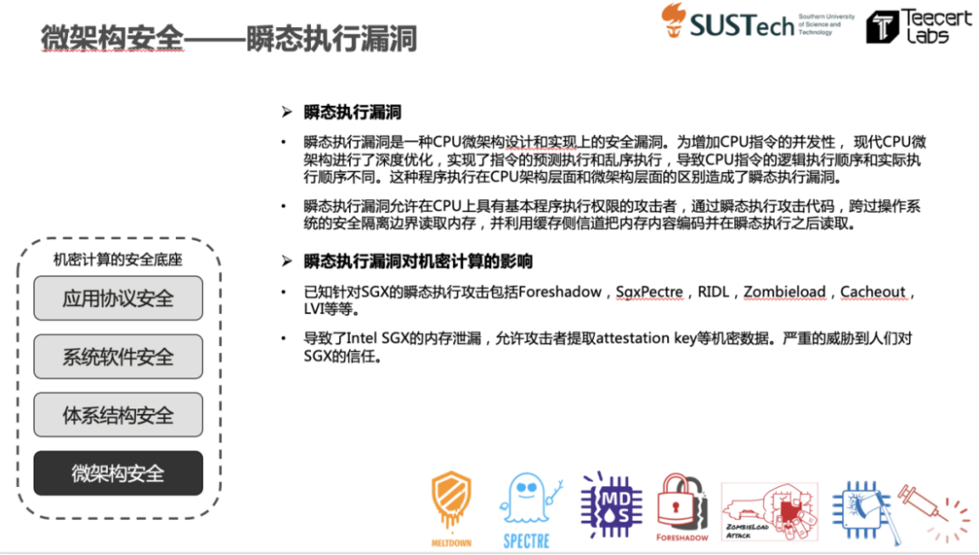 在了解了机密计算的研究背景和研究意义后,张教授介绍了机密计算的常见应用,并将机密计算的安全底座总结为四层安全架构,自底向上分别为:微架构安全、体系结构安全、系统软件安全、应用协议安全。随后,张教授依次对上述四层安全底座进行了内容展开及相关研究进展介绍。