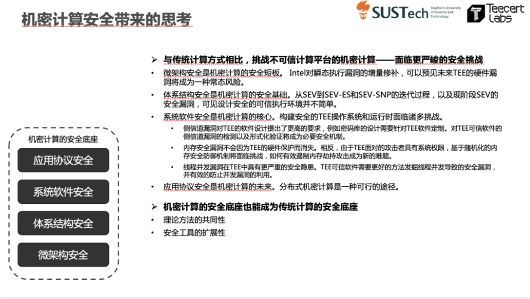 最后,张教授向大家分享了针对机密计算安全研究的一些思考。微架构安全是机密计算的安全短板,未来TEE的硬件漏洞将成为一种常态风险。体系结构安全是机密计算的安全基础,想要设计安全的可信执行环境并不是一件简单的事情。系统软件安全是机密计算的核心,但构建安全的TEE操作系统和运行时仍面临诸多挑战。应用协议安全是机密计算的未来,分布式机密计算可能是一种可行的途径。此外,机密计算的安全底座也可以成为传统计算的安全底座,理论方法存在一定的共同性,相关安全工具也有一定的扩展性。