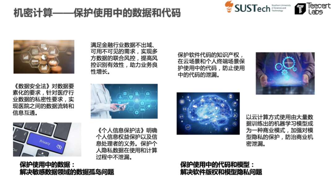 围绕机密计算,张教授首先向大家介绍了何为机密计算以及为何要研究机密计算。可信执行环境(TEE)是近年来提出的一种由CPU硬件支持的安全隔离机制,能够在通用CPU上通过软硬件协同的方式实现计算环境的隔离以及内存和外部储存的加密,用以防止恶意系统软件的对机密数据的读取和篡改。其安全原理包括:逻辑隔离,内存加密,远程验证和加密存储。而机密计算是一种利用TEE保护运算中的数据的计算方式,它利用TEE提供的加密和隔离的执行环境,对计算中的数据提供保护,防止恶意软件对计算中的数据进行非法访问和篡改,使得计算服务提供商能够以更安全、可信的方式管理机密数据。