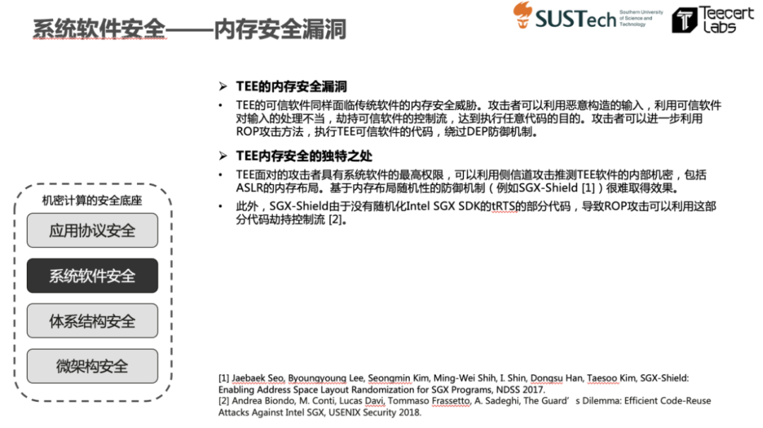 在内存安全方面,张教授指出TEE的可信软件同样面临传统软件的内存安全威胁。攻击者可以利用恶意构造的输入,利用可信软件对输入的处理不当,劫持可信软件的控制流,达到执行任意代码的目的。攻击者可以进一步利用ROP攻击方法,执行TEE可信软件的代码,绕过DEP防御机制。更糟糕的是,TEE面对的攻击者具有系统软件的最高权限,可以利用侧信道攻击推测TEE软件的内部机密,包括ASLR的内存布局。基于内存布局随机性的防御机制(例如SGX-Shield)很难取得效果。
