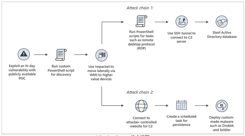伊朗黑客组织使用 N-day 漏洞和较旧的漏洞来破坏未打补丁的设备。一旦获得网络访问权限,攻击者使用自定义PowerShell 脚本搜集环境信息,以确定目标是否具有高价值。然后,使用 Impacket 框架在网络上横向传播,同时执行两个攻击链之一:第一个攻击链主要执行 PowerShell 脚本,使用 SSH 通道与 C2 通信,窃取目标的 Windows Active Directory 数据库,该数据库可用于获取用户凭据,从而帮助攻击者进一步入侵或逃避网络检测;第二个攻击链是部署名为 Drokbk 和 Soldier 的自定义后门恶意软件,两者都用于在受损网络上保持持久性并部署额外有效载荷,以及从 GitHub 存储库中检索命令和控制服务器列表。