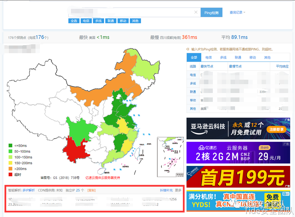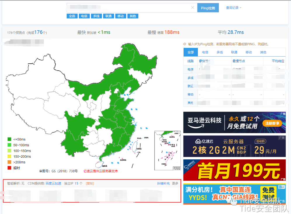 通过ping腾讯和京东进行测试可以看到两家使用了cdn,而ping青岛某公司未使用CDN