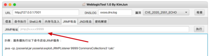 jrmp类型的漏洞只能使用jrmp模块进行攻击,在vps上使用yso启动jrmp,工具中填入vps的jrmp地址即可