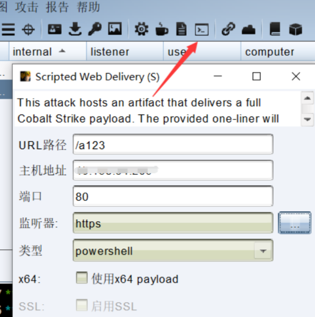 尝试cs自带的Scripted Web Delivery模块,直接创建一个web服务用于一键下载和执行powershell。
