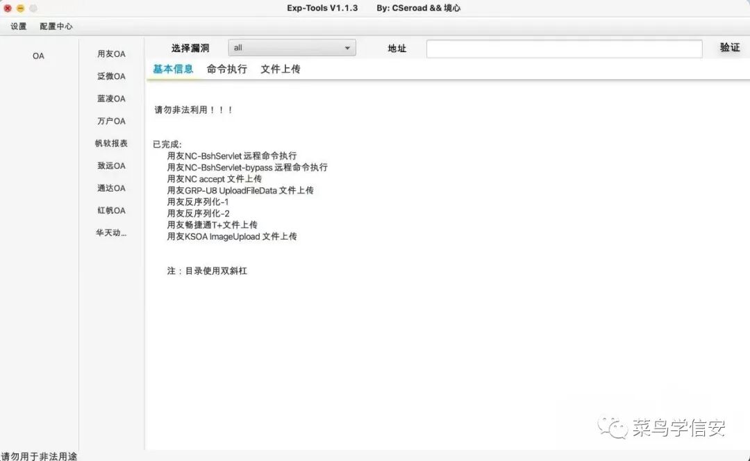 该工具使用了ExpDemo-JavaFX项目,保留了核心的数据包请求接口,使用jdk1.8环境开发。目前只编写了oa系列,对相关漏洞进行复现和分析,极力避免exp的误报和有效性。