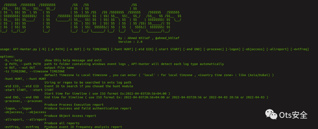 python3 -m pip install -r requirements.txtAPT-Hunter 易于使用,您只需使用参数 -h 来打印帮助以查看所需的选项。