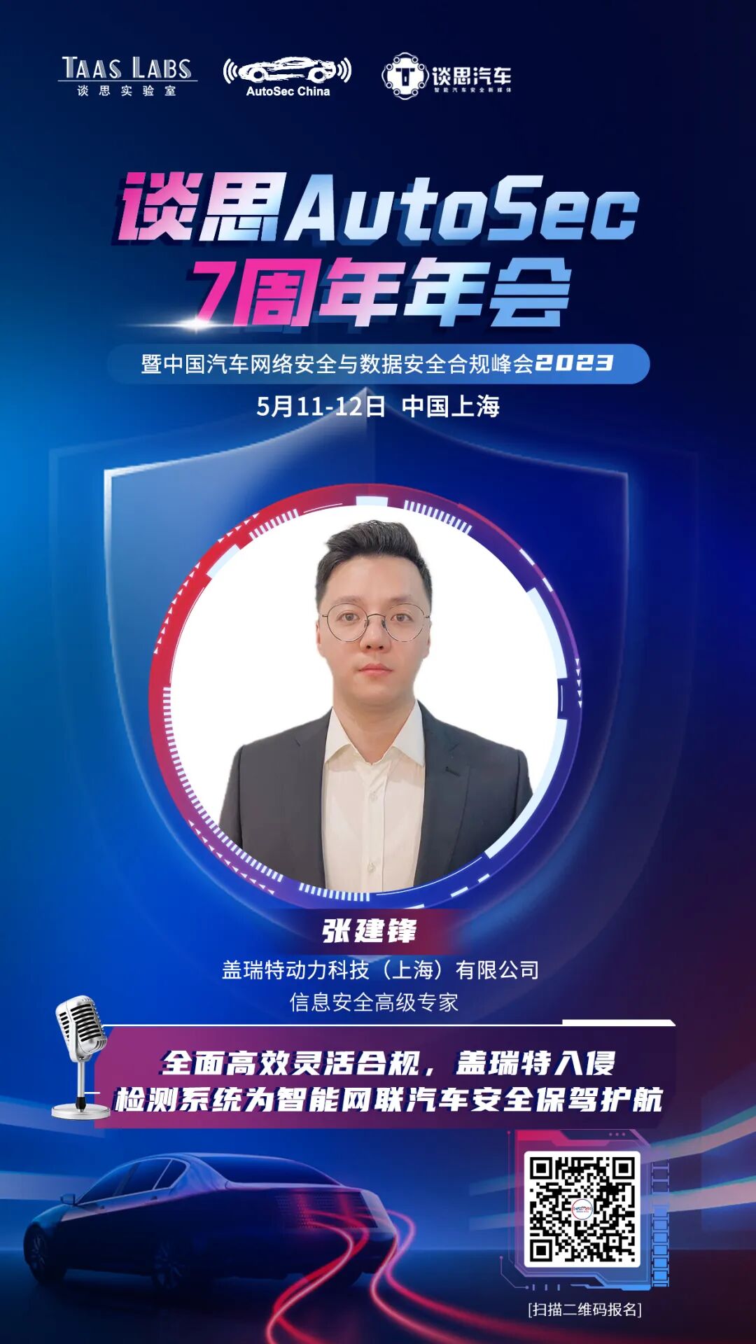 此次,盖瑞特信息安全高级专家张建锋先生,将在谈思AutoSec 行业7周年年会上分享“ 全面高效灵活合规,盖瑞特入侵检测系统为智能网联汽车安全保驾护航 ”的精彩话题。