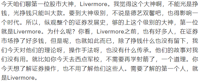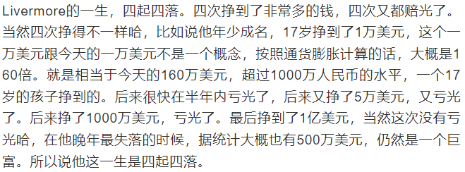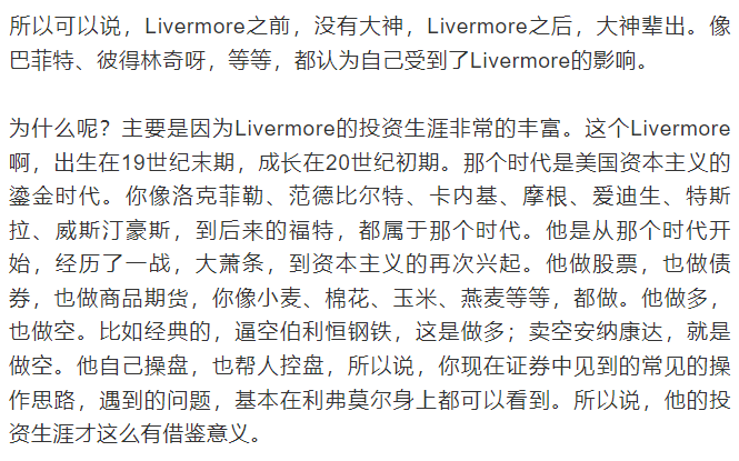 而且难能可贵的是他晚年,到了30年代的时候,那时候他的这套已经不太管用了哈,格雷厄姆已经崛起了,他还是用尽他毕生功力,或者叫融合他毕生的经历吧,写了一本回忆录,叫《股票作手回忆录》,书里就讲到了他大量的经典案例。这本书后来就成为投资者必备的圣经之一。很多他的后辈大神们都是读着这本书长大的。前一段时间看那个