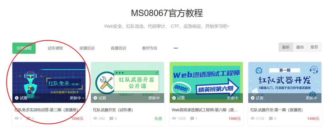 第三期课程进行了大幅度调整:除了对课程进行了优化,还增加了大量实战免杀技术,如如何编写属于自己的远控、杀毒软件的结构逻辑和查杀原理、如何免杀Windows Defender、免杀火绒、如何绕过360、如何自己创造新的免杀方式等。