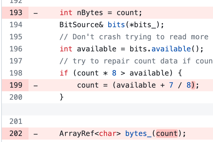 更深层的原因在于 nBytes 和 count 变量出现了不一致(有点 TOCTOU 的味道)。在 199 行修改了 count,之后又使用了之前 193 行保存的 nBytes