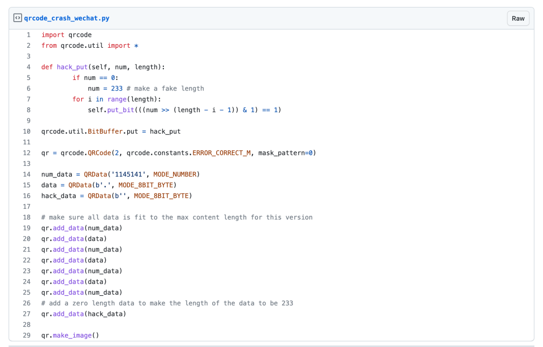 GitHub 用户 @GZTimeWalker 放出了一个 PoC,可以构造任意文本内容的 QRCode 让微信崩[1]: