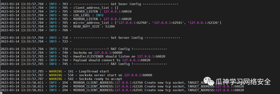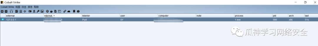 cobalt strike添加监听,端口选择输出信息RAT Config中的Handler/LISTEN中的端口(通常为60020),beacons为127.0.0.1