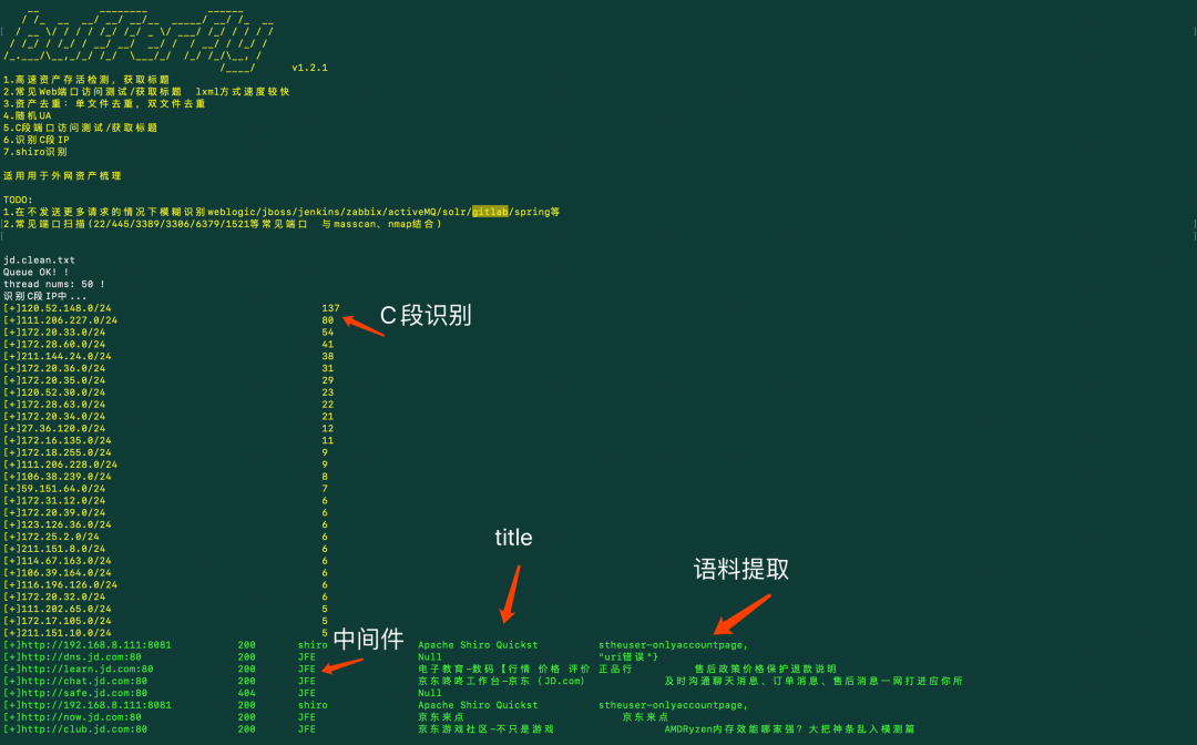 攻防资产处理小工具,对攻防前的信息搜集到的大批量资产/域名进行存活检测、获取标题头、语料提取、常见web端口检测、简单中间识别,去重等,便于筛选有价值资产。