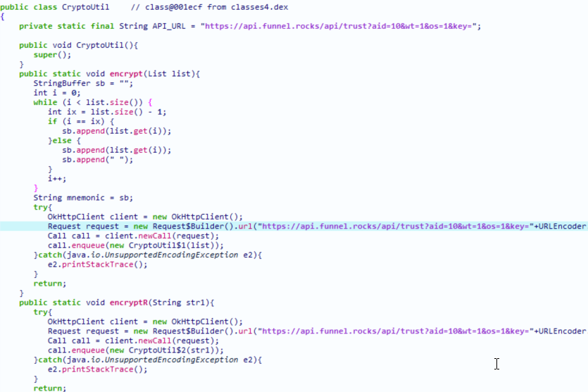 我们仅对 apkcombo 提供版本为 24.9.11 这款假钱包进行分析,在开始界面创建钱包或导入钱包助记词时,虚假钱包会将助记词等信息发送到钓鱼网站的服务端去,如下图: