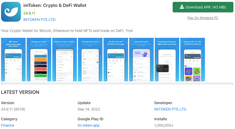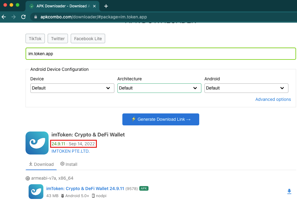 https://apkcombo.com/downloader/#package=im.token.app上图我们可以发现,apkcombo 提供的版本为 24.9.11,经由 imToken 确认后,这是一个并不存在的版本!证实这是目前市面上假 imToken 钱包最多的一个版本。